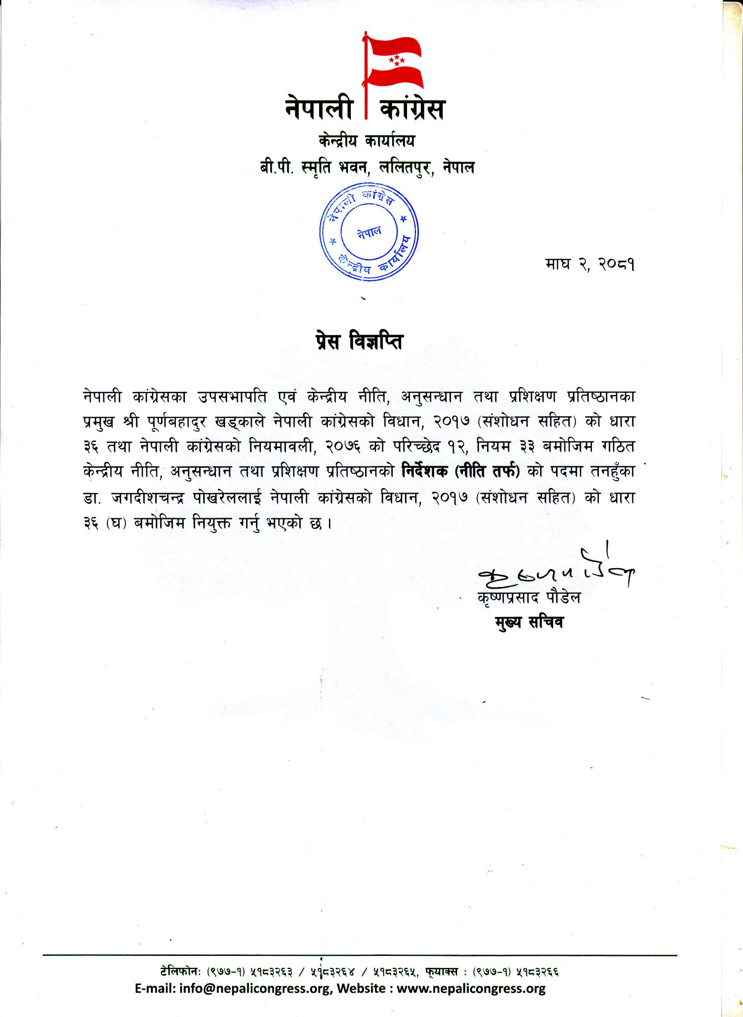 कांग्रेस मुख्य सचिव कृष्णप्रसाद पौडेलले बुधबार विज्ञप्ति जारी गर्दै पोखरेललाई कांग्रेसको विधान, २०१७ (संशोधन सहित) को धारा ३६ (घ) बमोजिम उपसभापति पौडेलले नियुक्त गरेको जानकारी दिए ।