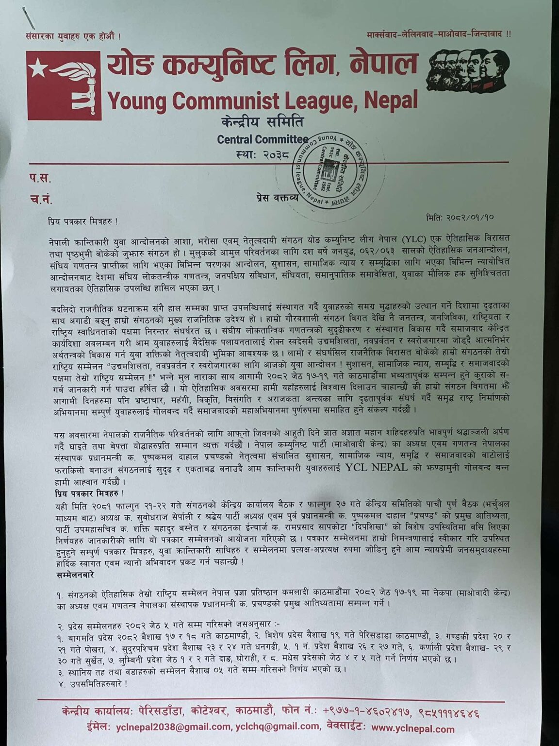 काठमाडौंमा पत्रकार सम्मेलन गरेर राष्ट्रिय सम्मेलनको नेपाल प्रज्ञा प्रतिष्ठान कमलादीमा अध्यक्ष पुष्पकमल दाहाल प्रचण्डले उद्घाटन गर्ने वाईसीएलका अध्यक्ष सुवोध शेर्पालीले बताए ।
