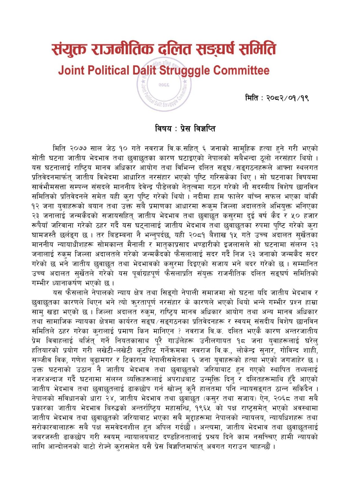 समितिका संयोजक एवं नेपाल दलित मुक्ति मोर्चाका अध्यक्ष दलजित श्रीपालीद्वारा जारी विज्ञप्तिमा जातीय भेदभाव तथा छुवाछूतलाई जबरजस्ती ढाकछोप गरी दण्डहिनतालाई प्रश्रय दिएको भन्दै आपत्ति जनाइएको छ ।