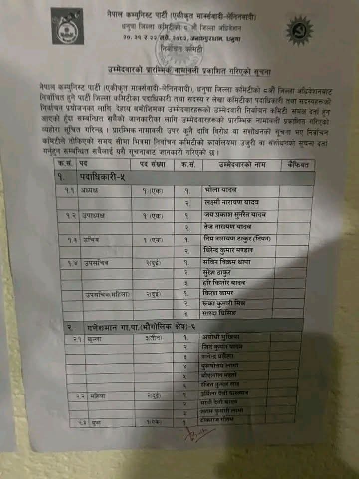उपाध्यक्षमा जयप्रकाश सुनरैत यादव र तेजनारायण यादव तथा सचिवमा दीप नारायण ठाकुर (दिपन) र धिरेन्द्र कुमार मण्डलको उम्मेदवारी परेको छ ।