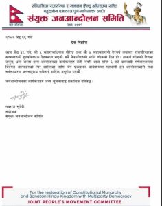 काठमाडौँ । राजतन्त्रको पक्षमा आन्दोलनरत संयुक्त जनआन्दोलन समितिले २४ वर्षअघि भएको दरबार हत्याकाण्डमा मारिनेहरूको स्मरणमा दीप प्रज्वलन गर्ने भएको छ ।