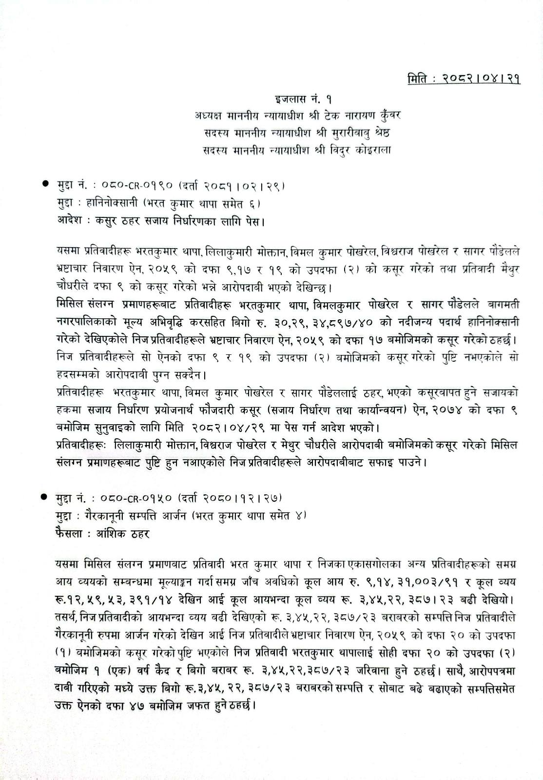 विशेष अदालतका न्यायाधीश अदालतका अध्यक्ष न्यायाधीश टेकनारायण कुँवर, सदस्य न्यायाधीश मुरारीबाबु श्रेष्ठ र विदुर कोइरालाको इजलासले थापासहित ६ जना विरुद्धको मुद्दामा थापासहित विमलकुमार पोखरेल र सागर पौडेललाई दोषी ठहर गरेको हो ।