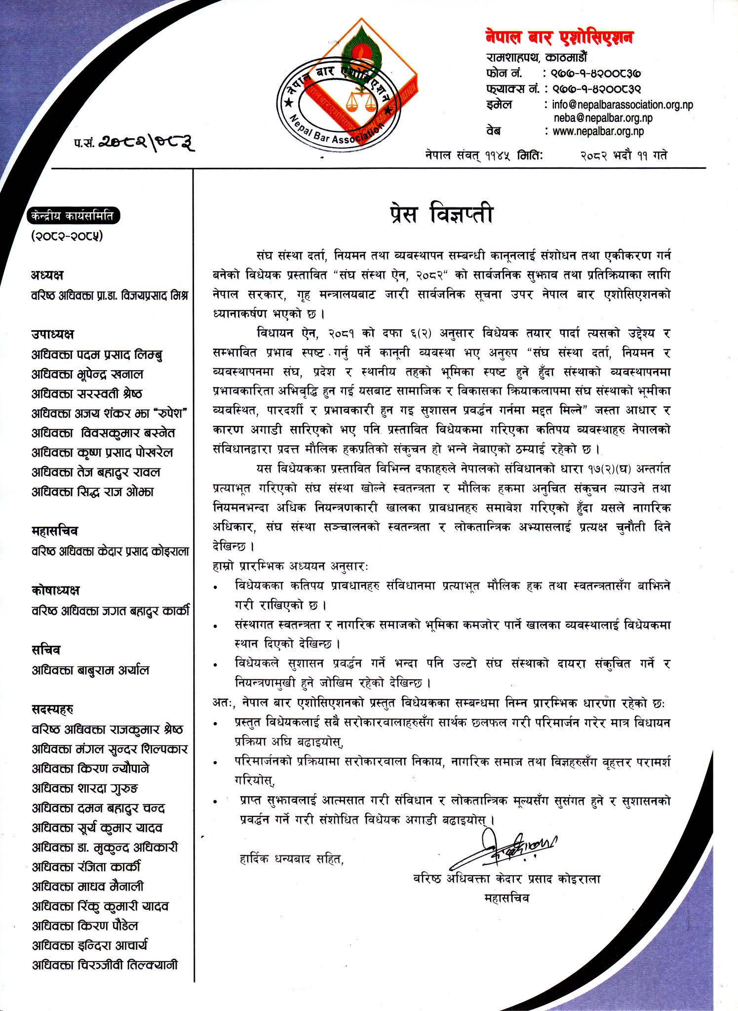 काठमाडौं । नेपाल बार एशोसिएशनले सरकारले हालै सार्वजनिक परामर्शका लागि प्रस्तुत गरेको संघ संस्था सम्बन्धी विधेयक, २०८१ प्रति गम्भीर आपत्ति जनाएको छ ।