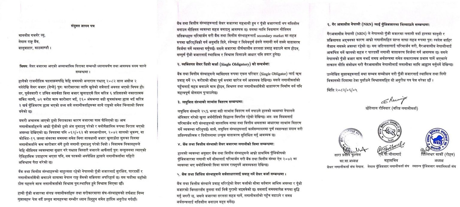 वरिष्ठ लगानीकर्ता छोटेलाल रौनियार, सेयर लगानीकर्ता संघ नेपालका कार्यवाहक अध्यक्ष ताराप्रसाद फुल्लेल, नेपाल पुँजी बजार लगानीकर्ता संघका महासचिव एसपी चौलागाईं र स्वतन्त्र पुँजी बजार लगानीकर्ता संघका अध्यक्ष रोहन कार्कीको टोलीले गभर्नरलाई भेटेको हो । उनीहरूले गभर्नर पौडेललाई संयुक्त रूपमा ज्ञापन पत्र समेत बुझाएका छन् ।