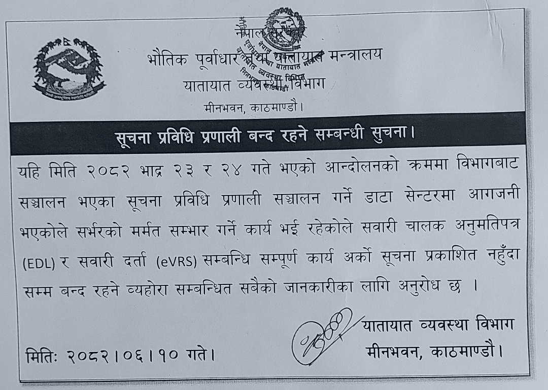 विभागले शुक्रबार सार्वजनिक गरेको सूचनामा भाद्र २३ र २४ गतेको आन्दोलनका क्रममा मीनभवनस्थित डाटा सेन्टरमा आगजनी भएकाले प्रणाली सञ्चालनमा समस्या आएको उल्लेख छ। यस कारण सर्वर मर्मत सम्भारको काम भइरहेकाले अर्को सूचना प्रकाशित नभएसम्म सेवाहरू उपलब्ध नहुने विभागले जनाएको छ।