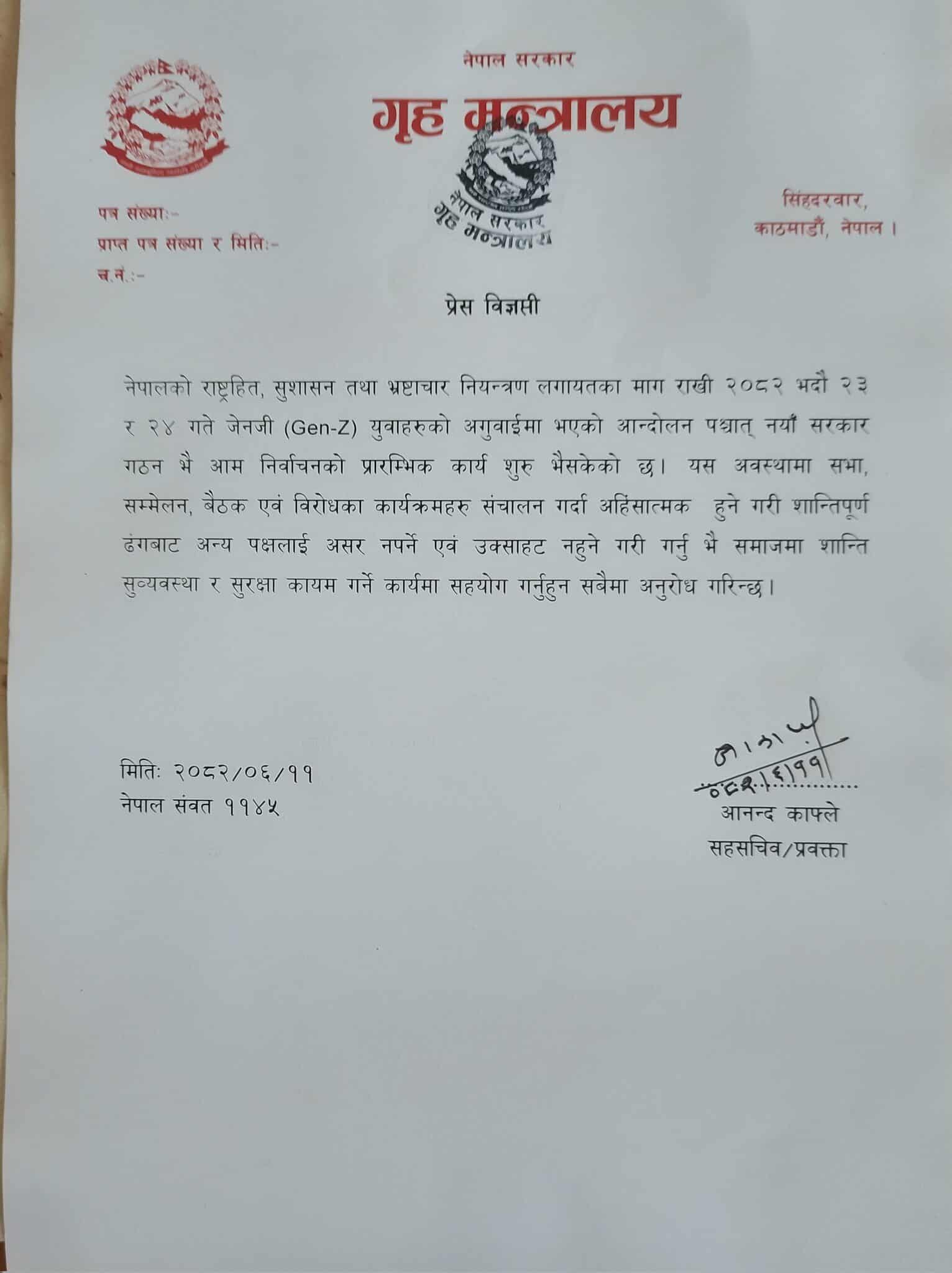 काठमाडौं । सरकारले अहिलेको अवस्थामा सभा सम्मेलन र विरोध कार्यक्रम सञ्चालन गर्दा शान्तिपूर्ण र अन्य पक्षलाई उक्साहट नहुनेगरी गर्न अनुरोध गरेको छ ।