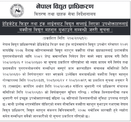 ‘२१ (एक्काइस) कार्यदिन अर्थात मिति २०८२–०७–१७ गतेभित्र भुक्तानी गर्न प्राधिकरण सञ्चालक समितिको मिति २०८२–०६–१० को निर्णय अनुसार सूचित गरिन्छ । मासिक किस्ताबन्दीमा रकम भुक्तानी गर्न इच्छुक उपभोक्ताहरूलाई बढीमा २८ महिनाको किस्ताबन्दीको सुविधा उपलब्ध गराइने छ’ सूचनामा भनिएको छ ।