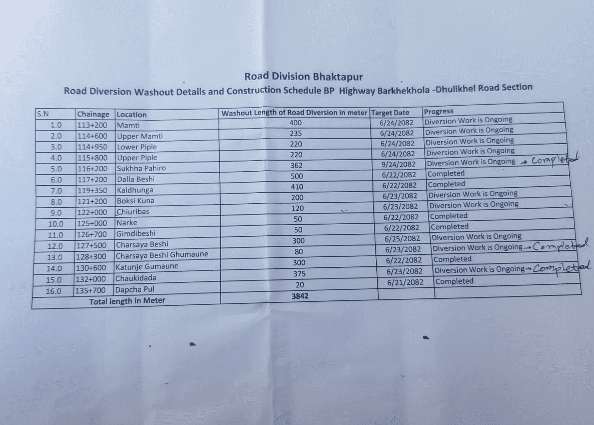 विभागका अनुसार डालाबेँसी ५ सय मिटर, कालढुंगा ४१०, नार्के ५० मिटर, गिम्दिबेँसी ५० मिटर, चार सय बेँसी घुमाउनेमा ८० मिटर, कटुन्जे घुमाउनेमा ३ सय मिटर, चौकीडाँडामा ३७५ मिटर र दाप्चा पुलमा ८० मिटरमा पुनर्निर्माण सम्पन्न भएको विभागले जनाएको छ ।