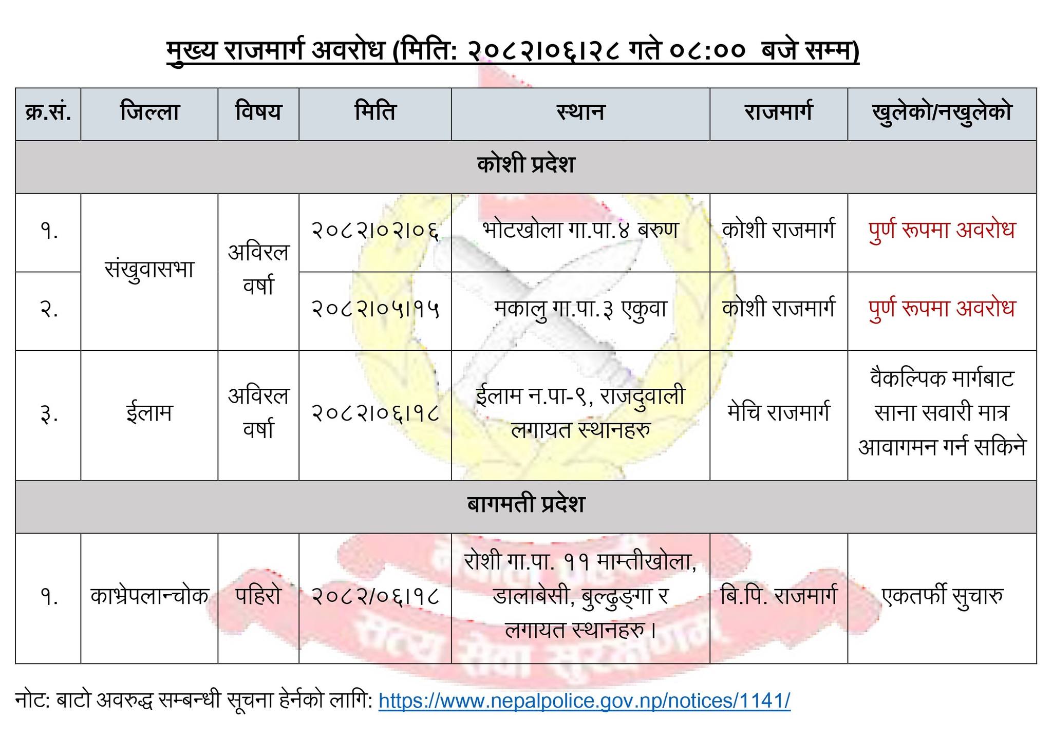 यस्तै मेची राजमार्गको इलाम नगरपालिका ९ स्थित राजदुवालीलगायतका स्थानहरूमा वैकल्पिक मार्गबाट साना सवारी मात्र आवागमन हुनसक्ने प्रहरीले जनाएको छ ।