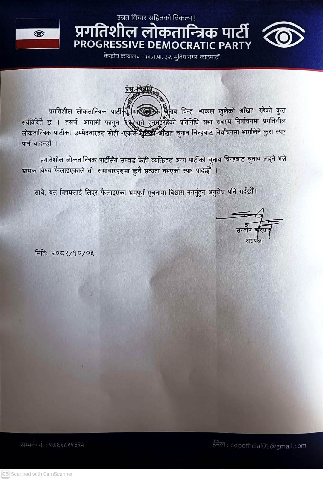 ‘प्रगतिशील लोकतान्त्रिक पार्टीको आधिकारिक निर्वाचन चिन्ह एकल खुलेको आँखा रहेको कुरा सर्वविदितै छ । तसर्थ, आगामी फागुन २१ गते हुन गइरहेको प्रतिनिधि सभा सदस्य निर्वाचनमा प्रगतिशील लोकतान्त्रिक पार्टीका उम्मेदवार सोही चुनाव चिन्हबाट निर्वाचनमा भाग लिने कुरा स्पष्ट पार्न चाहन्छौं’, विज्ञप्तिमा भनिएको छ ।