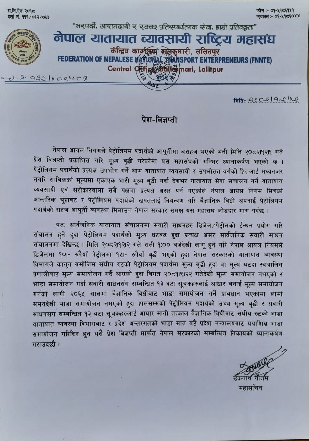 नेपाल आयल निगमले जेठ २ गते रातिदेखि लागू हुने गरी डिजेलमा प्रतिलिटर १० रुपैयाँ र पेट्रोलमा १५ रुपैयाँ मूल्य बढाएको भोलिपल्ट महासंघले विज्ञप्ति जारी गर्दै आफ्नो गम्भीर ध्यानाकर्षण भएको जनाएको हो । महासंघले एकैपटक यति धेरै मूल्य बढ्दा यातायात व्यवसायी र आम उपभोक्तालाई प्रत्यक्ष असर परेको जनाएको छ ।