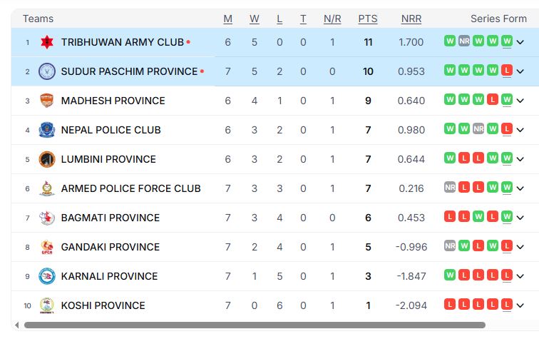 भर्खरै सम्पन्न खेलमा आर्मीले सुदूरपश्चिमलाई ७ विकेटले हराएको हो। आर्मीको जितमा कप्तान विनोद भण्डारीले शतक प्रहार गरे।