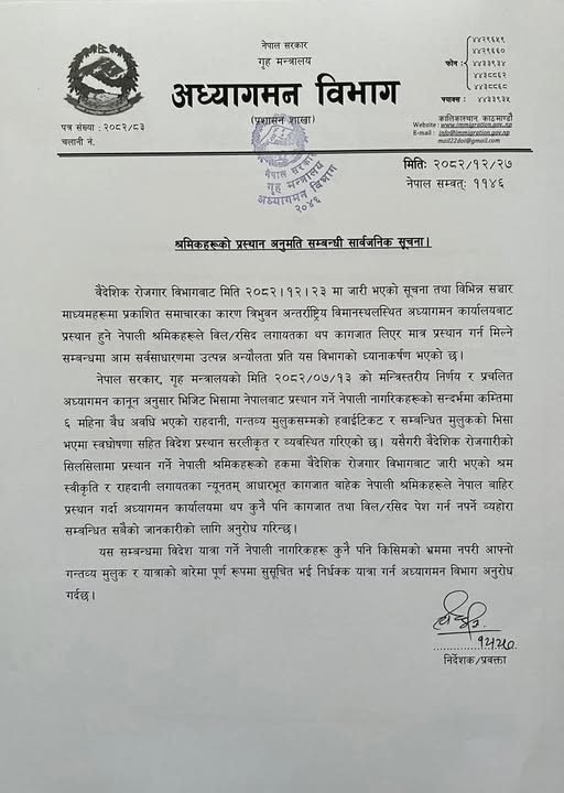 अध्यागमन विभागले आइतबार एक सार्वजनिक सूचना जारी गर्दै वैदेशिक रोजगारीमा जाने श्रमिकहरूले श्रम स्वीकृति र राहदानी (पासपोर्ट) जस्ता आधारभूत कागजात मात्र देखाए पुग्ने जनाएको छ। पछिल्लो समय विमानस्थलमा श्रमिकहरूले बिल र रसिद समेत बोक्नुपर्ने हल्ला फैलिएपछि विमानस्थलमा भिडभाड र अन्यौलता बढेको थियो। विभागले प्रचलित कानुन र मन्त्रिस्तरीय निर्णय अनुसार श्रमिकहरूलाई प्रस्थान अनुमति दिँदा अतिरिक्त झन्झट नदिइने स्पष्ट पारेको छ।