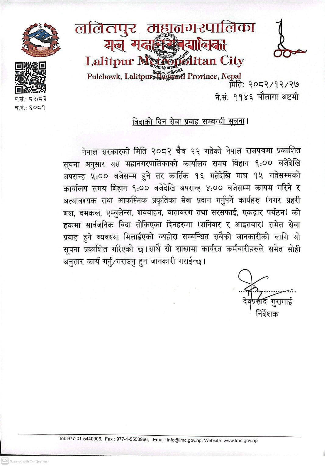 काठमाडौँ । ललितपुर महानगरपालिकाले सार्वजनिक बिदाका दिनहरूमा समेत अत्यावश्यक सेवाहरू सुचारु गर्ने निर्णय गरेको छ । सरकारले सार्वजनिक बिदा दिइएको शनिबार र आइतबार पनि महानगरबाट सेवा दिने निर्णय गरेको महानगरले जनाएको छ ।