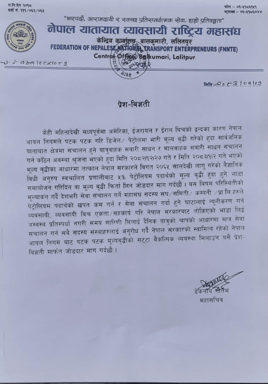महासंघले विज्ञप्ति जारी गर्दै मध्यपूर्वमा बढेको तनावका कारण देखाउँदै नेपाल आयल निगमले डिजेल र पेट्रोलमा गरेको भारी मूल्यवृद्धिले सार्वजनिक यातायात क्षेत्र धराशायी बन्ने अवस्था आएको बताएको छ । विज्ञप्तिमा उल्लेख भए अनुसार मिति चैत २७ र वैशाख २ मा भएको मूल्यवृद्धिका कारण सार्वजनिक यातायात र मालवाहक सवारी साधन सञ्चालन गर्न निकै कठिन भएको छ ।