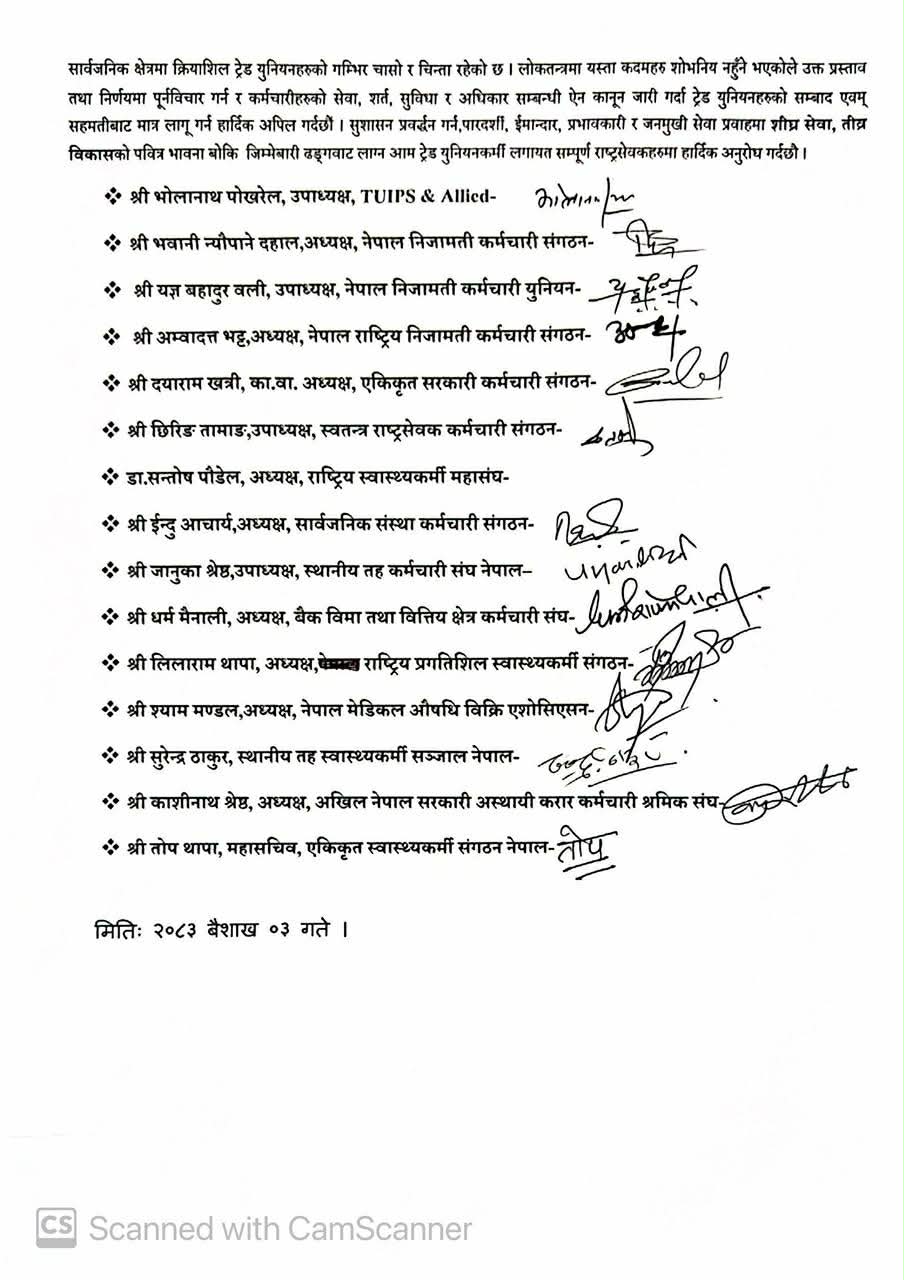 विज्ञप्तिमा नेपाल निजामती कर्मचारी संगठन, नेपाल निजामती कर्मचारी युनियन, नेपाल राष्ट्रिय निजामती कर्मचारी संगठन, एकीकृत सरकारी कर्मचारी संगठन, राष्ट्रिय स्वास्थ्यकर्मी महासंघ, सार्वजनिक संस्था कर्मचारी संगठन लगायतका १५ वटा संस्थाका प्रतिनिधिले हस्ताक्षर गरेका छन्।