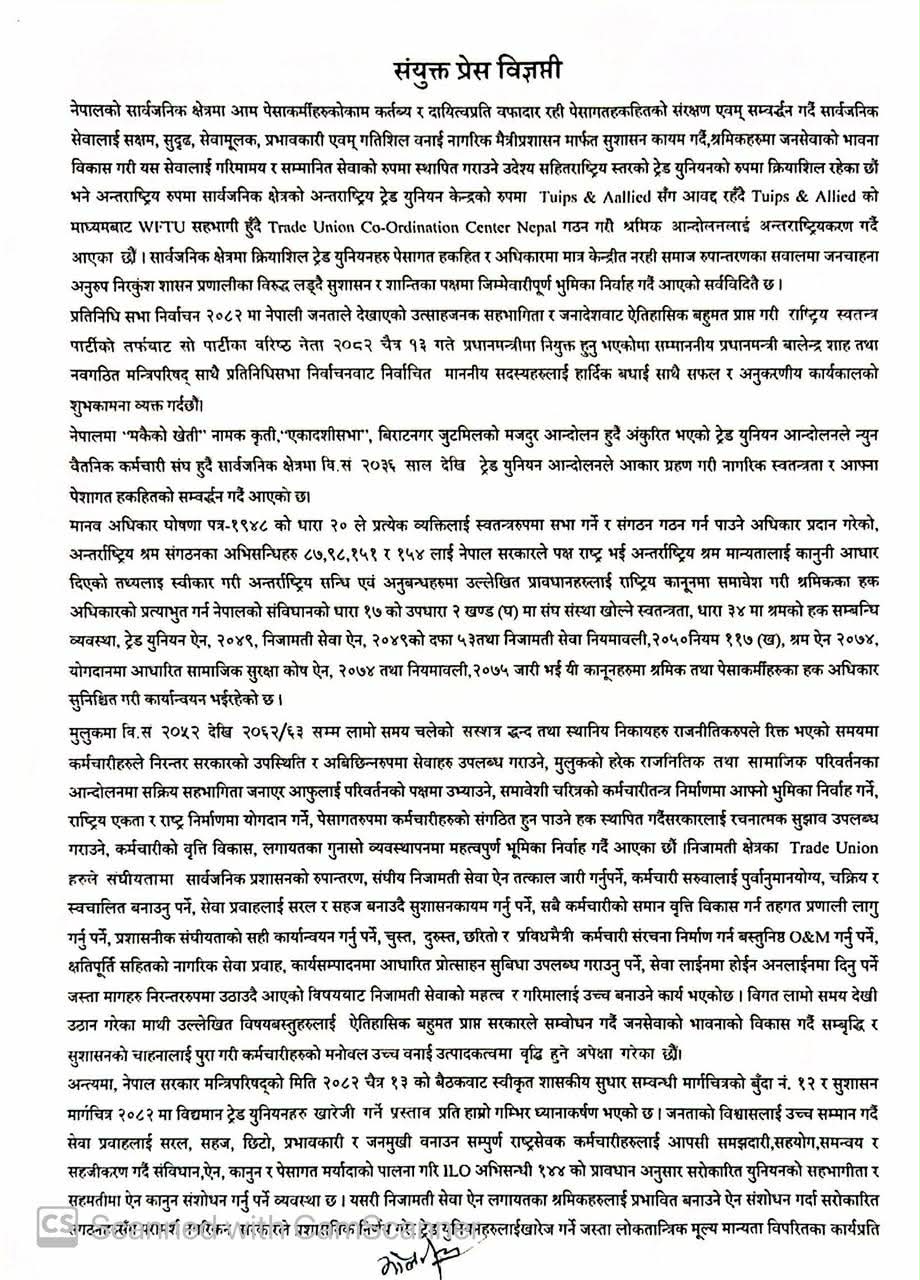 बालेन्द्र शाह सरकारद्वारा सुशासन मार्गचित्रमा राखिएको ट्रेड युनियनहरू खारेजी गर्ने प्रस्तावलाई लिएर उनीहरूले ध्यानाकर्षण जनाएका छन् । विज्ञप्तिमा नेपालमा ‘मकैको खेती’, ‘एकादशी सभा’, विराटनगर जुटमिलको मजदुर आन्दोलन हुँदै २०३६ सालदेखि नै ट्रेड युनियन आन्दोलनले आकार ग्रहण गरेको र नागरिक स्वतन्त्रता तथा पेशागत हकहितका लागि महत्वपूर्ण भूमिका खेलेको स्मरण गरिएको छ ।