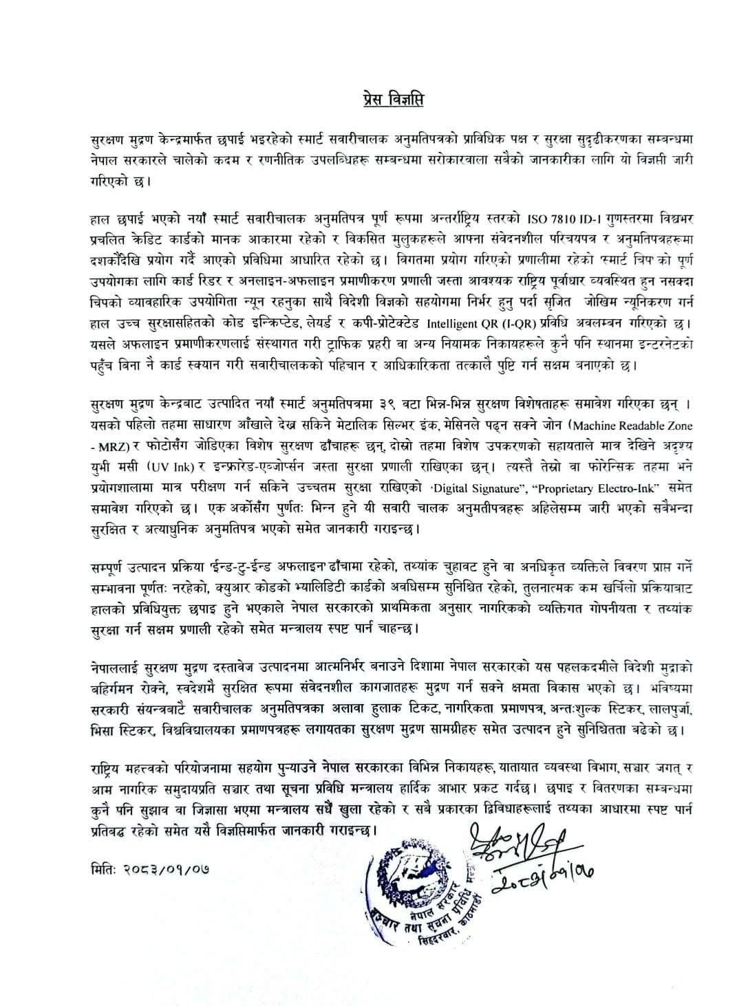 विगतमा यातायात व्यवस्था विभाग आफैँले मास प्रिन्टरमार्फत चिप जडित लाइसेन्स छाप्दै आएको थियो । तर, आन्दोलनका क्रममा उक्त मेसिनमा क्षति पुगी मर्मत हुन नसक्ने अवस्था आएपछि विभागले सञ्चार तथा सूचना प्रविधि मन्त्रालय अन्तर्गतको सुरक्षण मुद्रण केन्द्रसँग क्यूआर कोडसहितको लाइसेन्स छपाइ गर्ने सम्झौता गरेको थियो ।