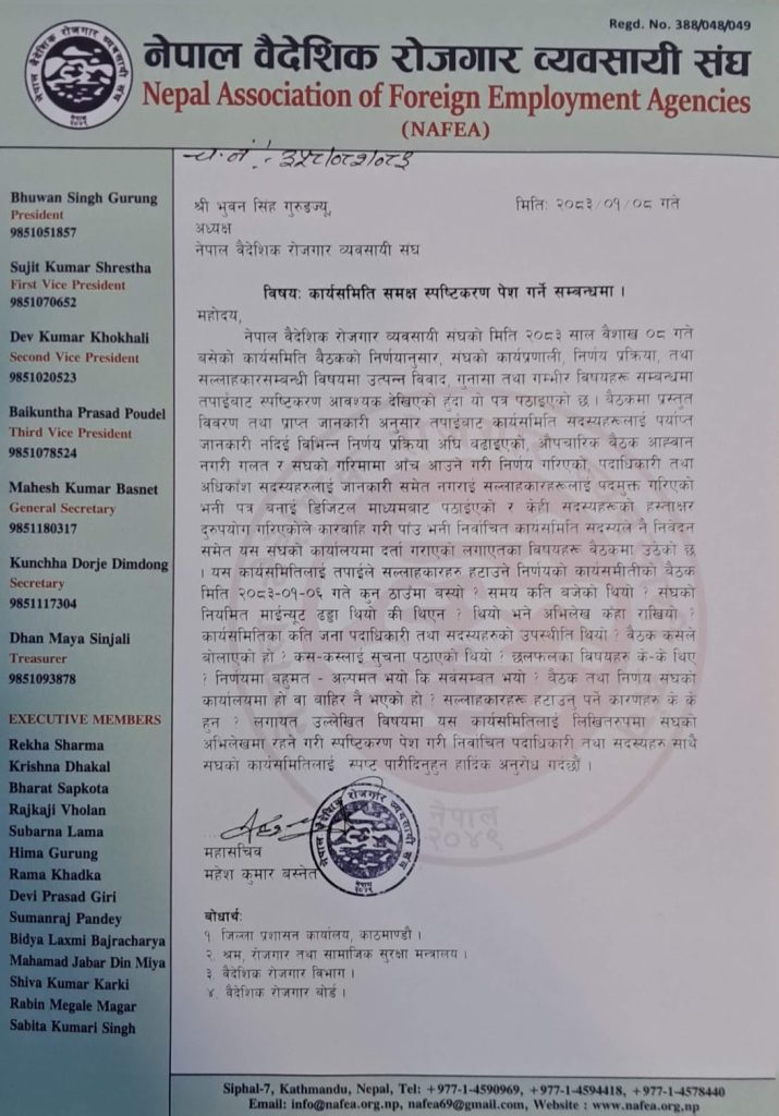 बुधबार महासचिव बस्नेतसहितका केही सदस्यको बैठकले अध्यक्ष गुरूङलाई स्पष्टीकरण सोधेको थियो । स्पष्टीकरणमा संघको कार्यप्रणाली, निर्णय प्रक्रिया तथा सल्लाहकारसम्बन्धी विषयमा विवाद, गुनासा तथा गम्भीर प्रश्न उठेकाले स्पष्ट पार्न आवश्यक देखिएको उल्लेख छ ।