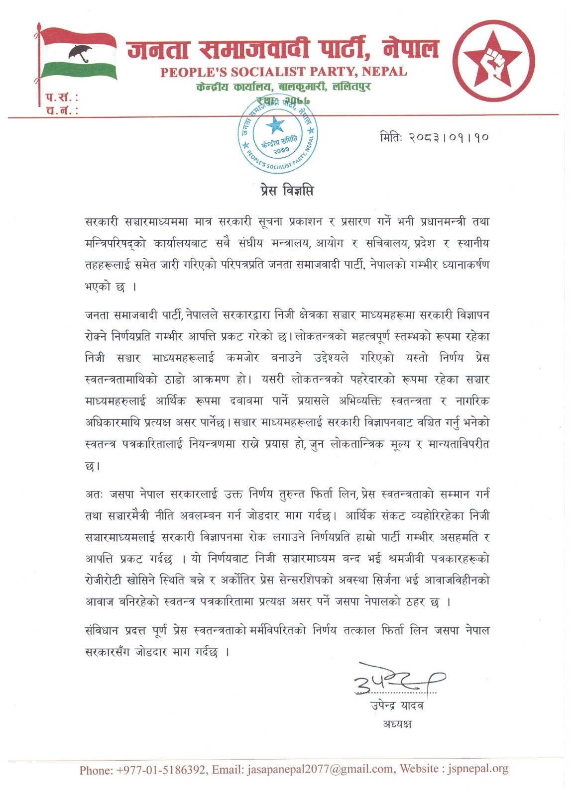 काठमाडौँ । सरकारले निजी क्षेत्रका सञ्चारमाध्यमहरूलाई सरकारी विज्ञापन र सूचना उपलब्ध नगराउने गरी गरेको निर्णयप्रति जनता समाजवादी पार्टी (जसपा), नेपालले कडा आपत्ति जनाएको छ।