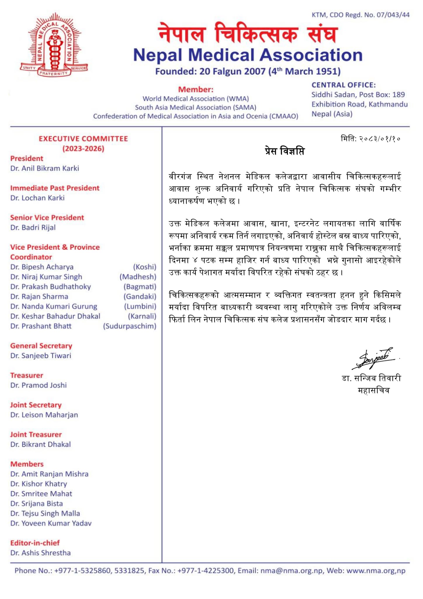 सङ्घका महासचिव डा.सञ्जीव तिवारीद्वारा जारी विज्ञप्तिअनुसार, नेशनल मेडिकल कलेजले आवासीय चिकित्सकहरूका लागि आवास, खाना र इन्टरनेट बापतको शुल्क वार्षिक रूपमा बुझाउन अनिवार्य गरेको छ।