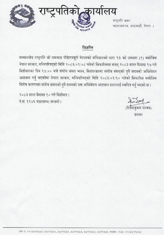 मन्त्रिपरिषद्ले राष्ट्रपति पौडेललाई पठाएको पत्रमा अधिवेशन विशेष कारणले स्थगित गर्नुपरेको उल्लेख गरेको छ ।