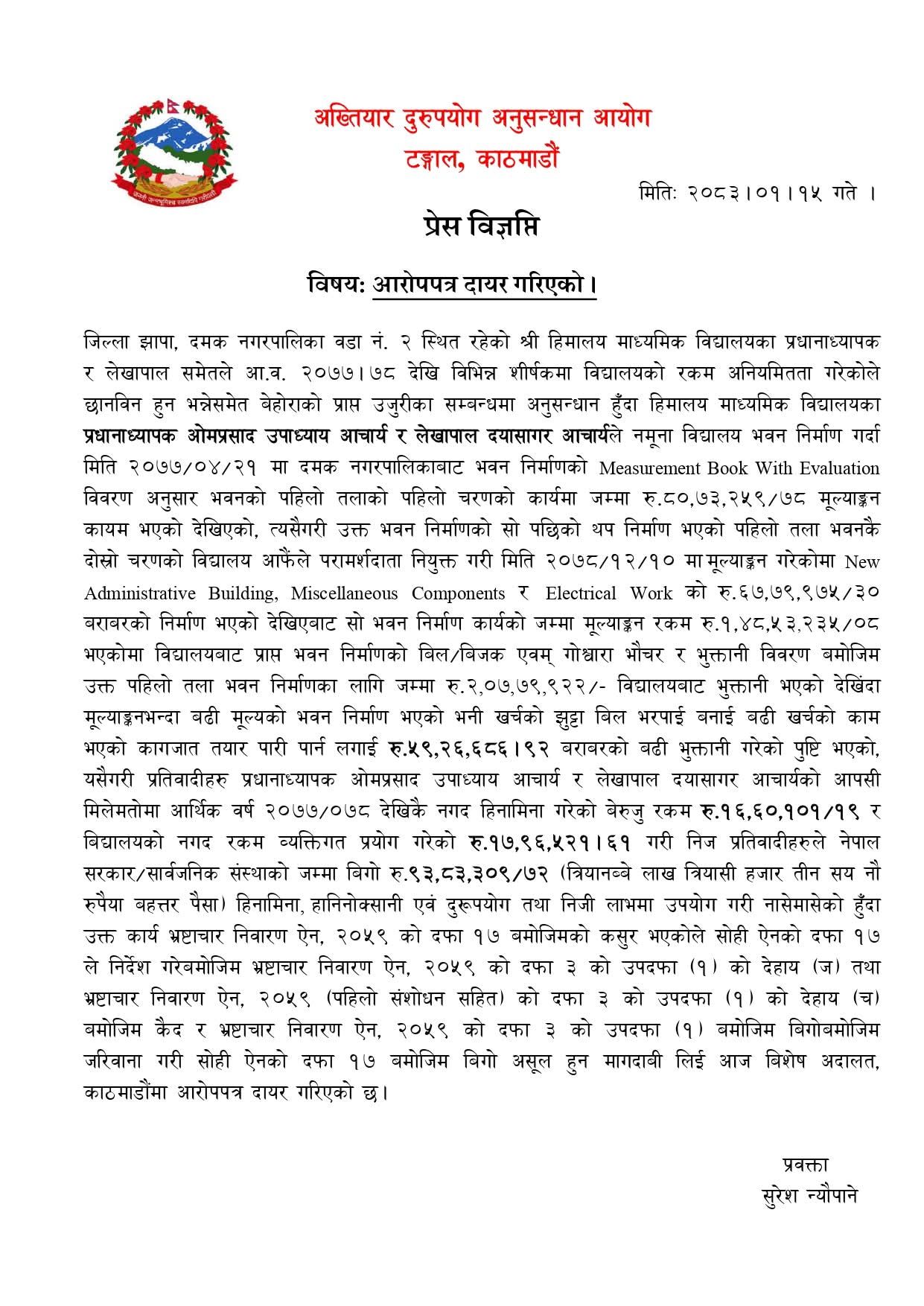 विद्यालयको भवन निर्माणलगायतमा भ्रष्टाचार अभियोगमा प्रधानाध्यापक ओमप्रसाद उपाध्याय आचार्य र लेखापाल दयासागर आचार्यविरुद्ध ९३ लाख ८३ हजार ३०९ रूपैयाँ बिगो दाबीसहित अख्तियारले मुद्दा दायर गरेको हो ।